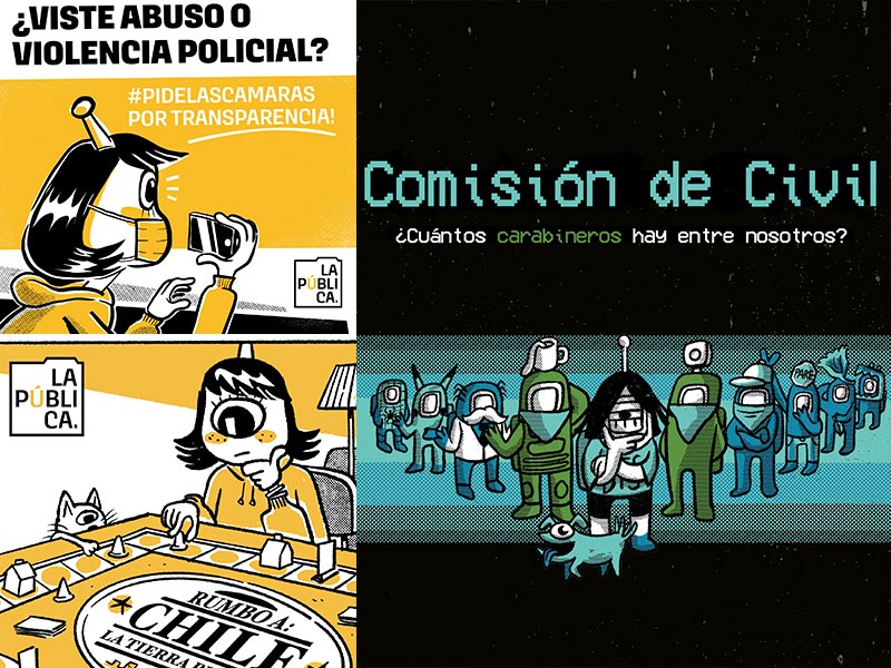 Paulette: “Lo que nos interesaba era mostrar cómo el acceder a documentos públicos, te permitía revelar fallas en políticas públicas o tener de primera mano información que no estaba mediada por una fuente que pudiera equivocarse o engañarte. En ese sentido, dijimos ‘bueno, vamos a sacarle el juego a la ley’ y no solo a publicar documentos, sino que vamos a usar el periodismo como una manera de mostrar por qué acceder a estos documentos es importante, qué historias hay detrás de ellos y qué es lo que nos revelan. Y decidimos crear La Pública. Después vino el proceso de crear nuestra identidad y no queríamos ser un medio aburrido, queríamos acceder a información, pero también entenderla y traducirla en algo simple. Entre todo el equipo creativo se decidió crear una extraterrestre que la llamamos Amparo -en referencia al recurso judicial- que llegaba a la tierra y usaba la Ley de Transparencia para comprender cómo eran las cosas. Nuestro foco, entonces, es la ley, pero también es importante entender que la información no es necesariamente un documento. Hemos accedido a las cámaras corporales de Carabineros, a reuniones por Zoom y a una multiplicidad de otros formatos”.