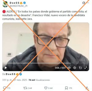 Un usuario de X publicó el 21 de noviembre, luego de que Francisco Vidal fuera nombrado vocero de campaña de Jeannette Jara, un extracto de un video donde dice: “En todos los países donde gobierna el Partido Comunista, el resultado es un desastre”.