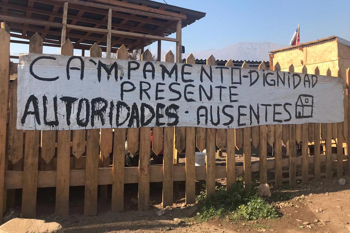 “El nombre Dignidad surge por la dignidad hacia las personas, hacia los niños, hacia sus derechos, hacía que todos tenemos derecho a una vivienda”, relata Emmanuel Garcés (39), dirigente del campamento. “Ellos estaban perdidos diciendo que en Chile ya no existen campamentos y existen muchos, muchos campamentos”, asegura el líder comunitario, quien en la entrada de su casa colocó un letrero como bienvenida y consigna del lugar, como se lee en la imagen inferior.