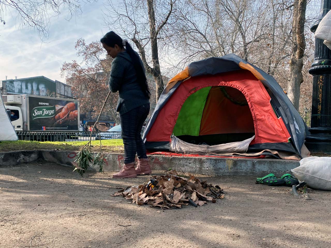 La compleja situación migratoria en Latinoamérica ha causado que muchas familias extranjeras decidan venir a Chile en busca de mejores oportunidades, pero al ingresar por pasos no habilitados y sin documentos, no logran conseguir empleos formales; y por lo tanto tampoco ingresos suficientes para pagar un techo. En esa emergencia, no ven otra salida que instalar carpas en plena vía pública y sobrevivir.