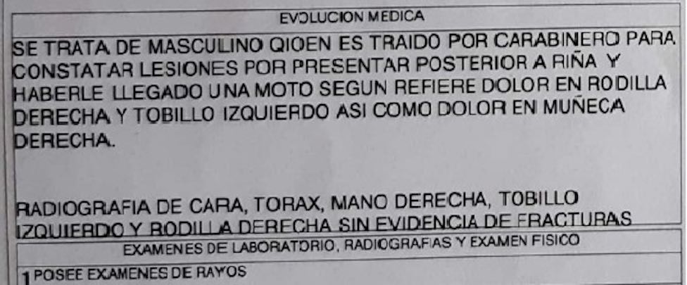 El informe médico indicó que Fuentes resultó con contusiones en sus piernas, cráneo y rostro, también que estas se produjeron en una riña callejera y por el atropello de una moto, de cual no se especificó en ningún momento que fue una de carabineros.
