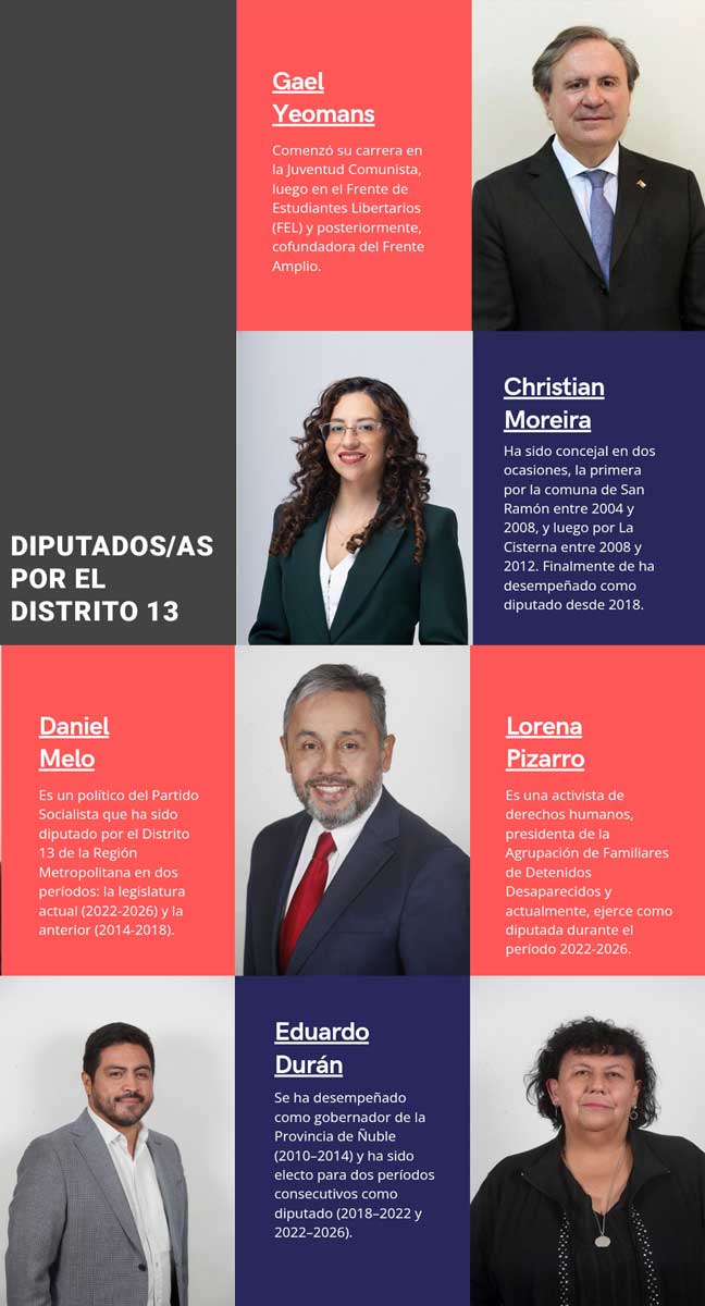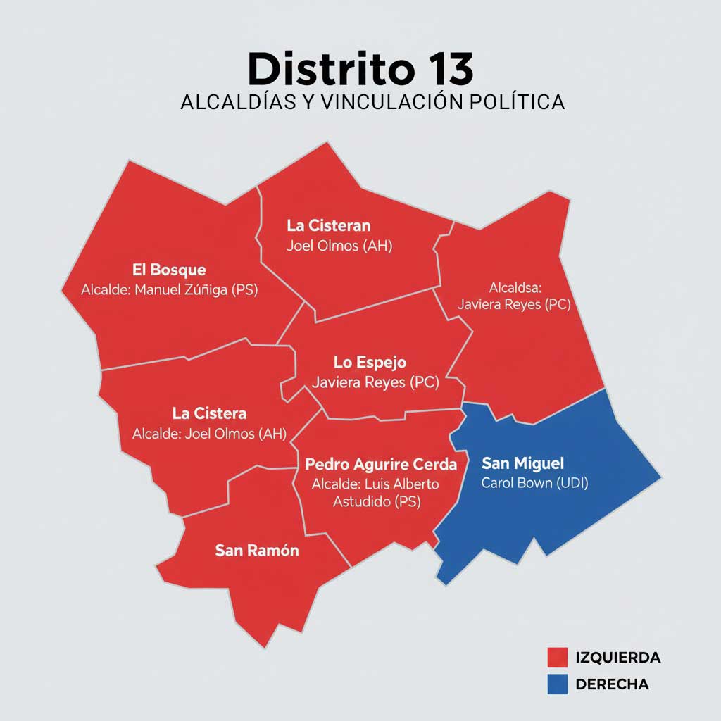 El Distrito 13, que reúne las comunas de El Bosque, La Cisterna, Lo Espejo, Pedro Aguirre Cerda, San Miguel y San Ramón, se ha convertido en una prioridad para el oficialismo. Desde la implementación del nuevo sistema electoral en 2017, el bloque de gobierno ha logrado mantener la mayoría de los escaños en este sector, convirtiéndose en un bastión progresista en el sur de Santiago.