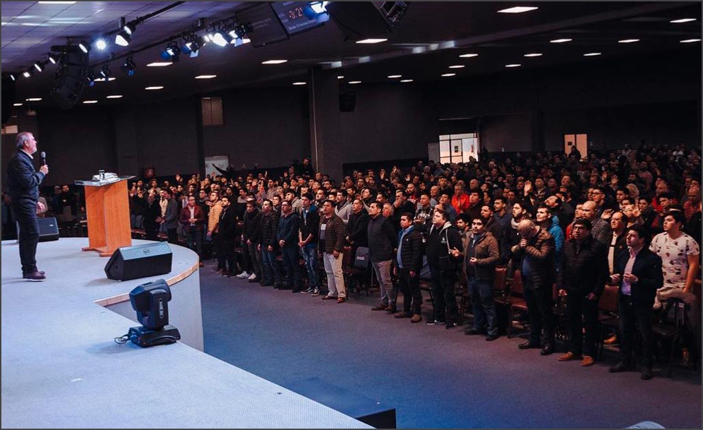 El salón de paredes blancas y azules tiene capacidad para recibir a cerca de 5.000 personas. Al fondo y al centro del salón se despliega un completo equipo audiovisual: mesas de sonido, computadores y proyectores que apuntan hacia el escenario principal, donde aparece en una de las tres pantallas gigantes, justo ahora, la cuenta regresiva que dará inicio al culto.