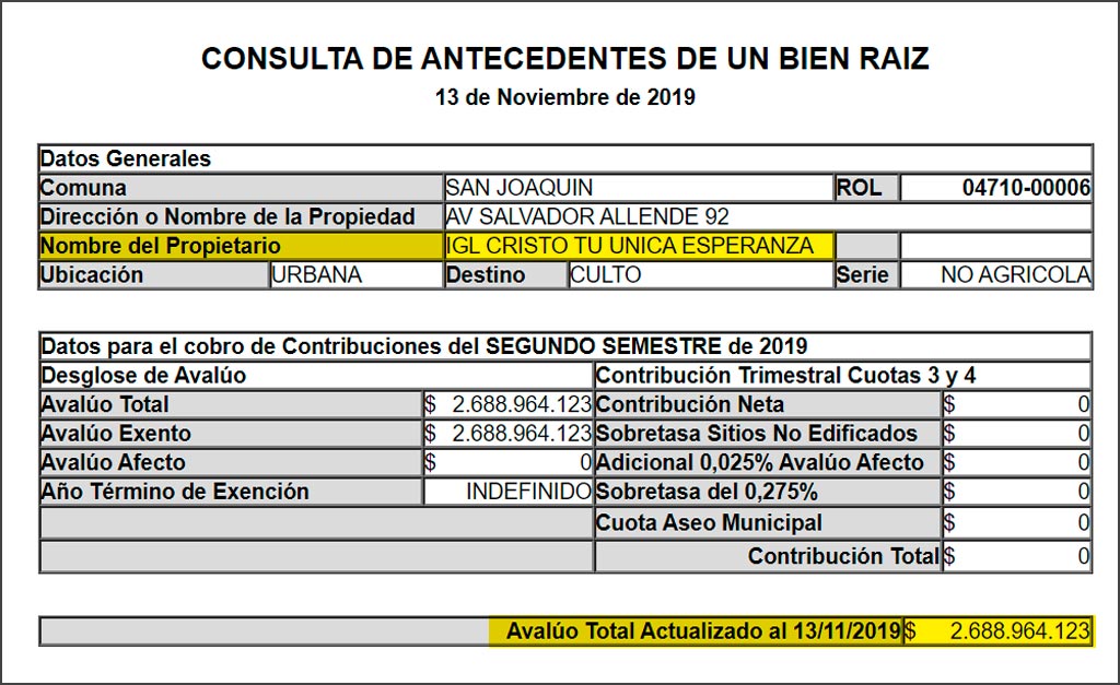 El terreno donde se levantó la iglesia Cristo Tu Única Esperanza, ubicada en avenida Salvador Allende N° 92, tiene una superficie de 14.600 metros cuadrados. La escritura de compraventa del terreno –la que obtuvimos en el Conservador de Bienes Raíces de San Miguel– indica que ese paño de tierra fue adquirido por la iglesia en noviembre de 2013. Para ello, la denominación religiosa fundada por Fernando Chaparro desembolsó UF 116.430, unos $2.704 millones (al valor de la UF de la época). A más de 15 años de esa compra, el valor comercial de esa propiedad puede fácilmente haberse duplicado (su avalúo fiscal, que en promedio corresponde a la mitad del valor comercial, alcanza actualmente los $2.689 millones).