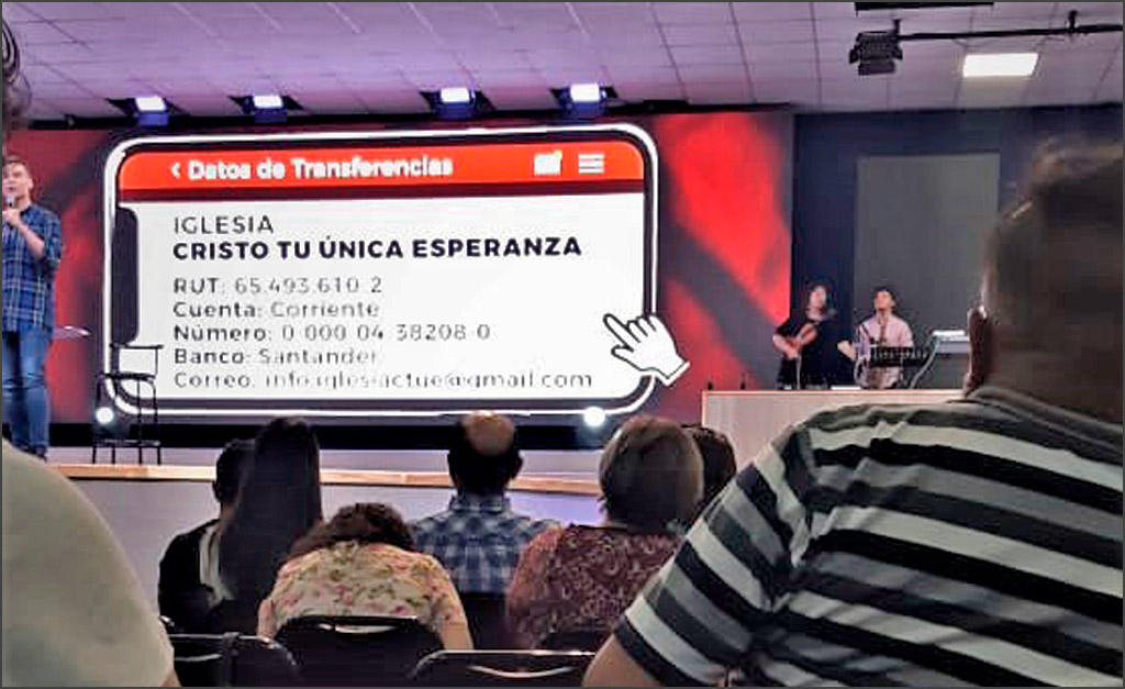 Casi al término de la ceremonia, Chaparro junior da la señal para que, como ya es costumbre, los asistentes colaboren con la iglesia. En la pantalla principal del templo proyectan una imagen con los datos de una cuenta corriente del banco Santander. Quienes no tengan dinero en efectivo pueden hacer una transferencia. La familia Chaparro sabe bien cuánto cuesta mantener la obra.