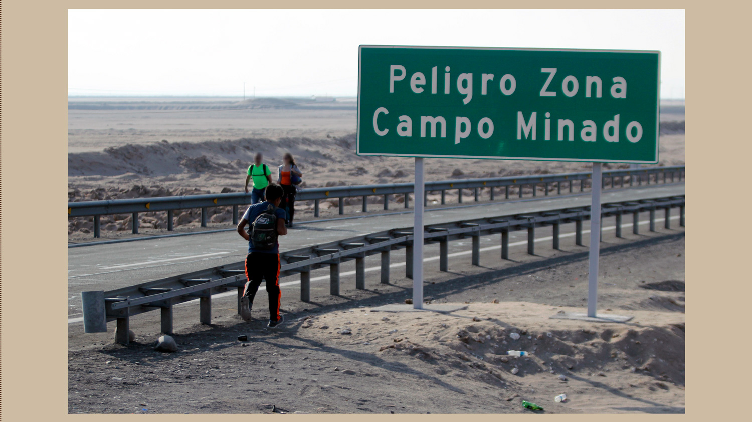 La ruta que el guía había definido hacia Chile se distanciaba del sector costero, hasta cruzar la desértica Quebrada Escritos, en Arica. Allí, el colombiano les advirtió los peligros del lugar debido a que se trataba de una zona sembrada de minas antipersonales y antitanques.