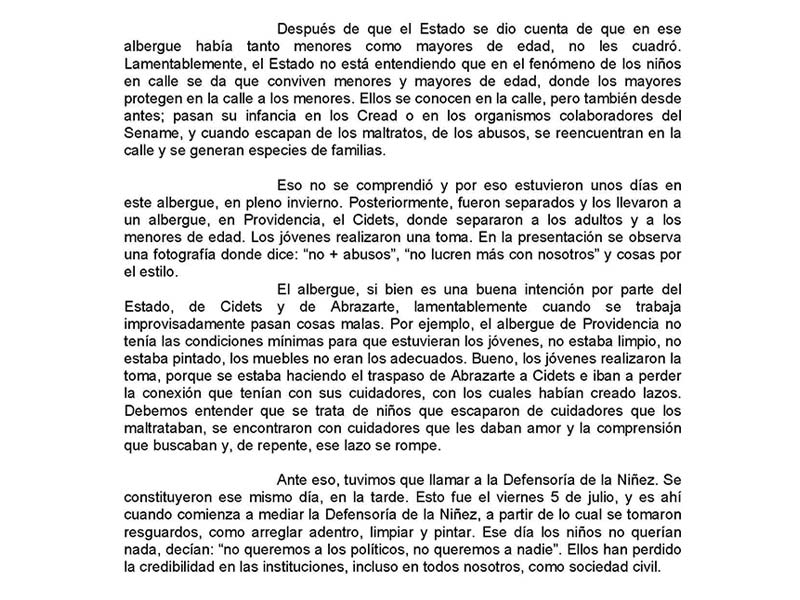 En ella, la directora de la Fundación Infancia Nathalie Oyarce denunció que luego del último conteo de niños, niñas y adolescentes en situación de calle de 2018, “los albergues se hicieron de manera improvisada, pues no hubo planificación. Por ejemplo, una iglesia que está en Catedral con San Martín fue ocupada como albergue por unos días”, mezclando 11 niños y cuatro mayores de edad.