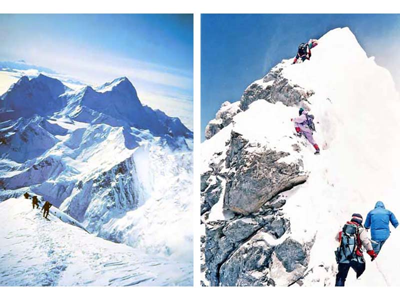 A la izquierda: Expedición de Jordán a 8.450 metros aproximadamente. | A la derecha: Purto, de morado, en el Hillary Step, a punto de hacer cumbre