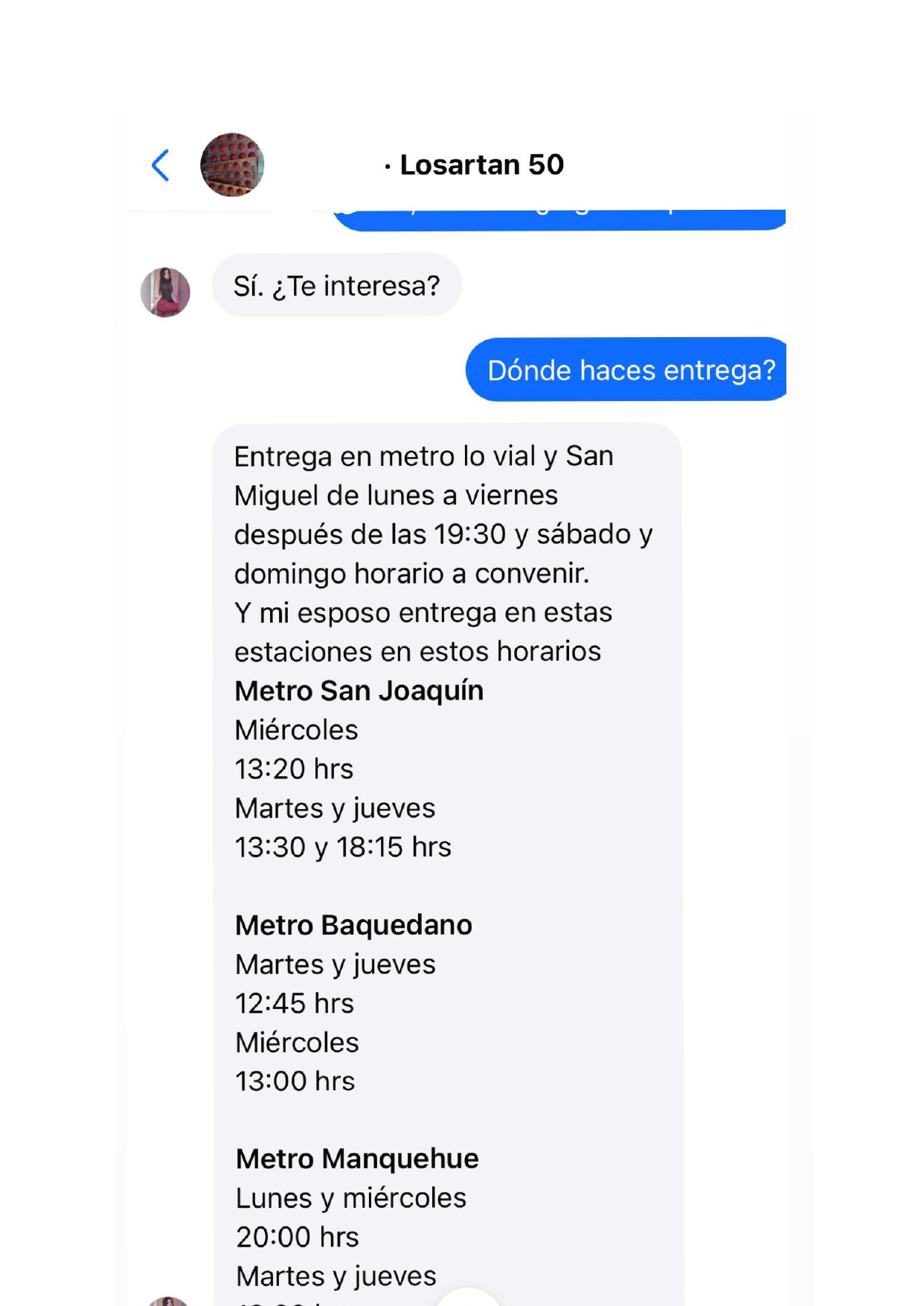 La Ley 20.000, que regula las drogas y sustancias sujetas a control en Chile, también se aplica a los medicamentos distribuidos sin autorización. La norma establece sanciones que pueden ir desde multas millonarias hasta penas de cárcel, según la gravedad del caso. Aun así, hay vendedores que comparten públicamente en redes su calendario semanal de días, horarios y metros donde entregan. Una usuaria que vende losartán en Marketplace, un medicamento para la presión arterial, responde con el mismo mensaje a todos los interesados. Un texto breve y formal que podría pasar por el de una empresa: