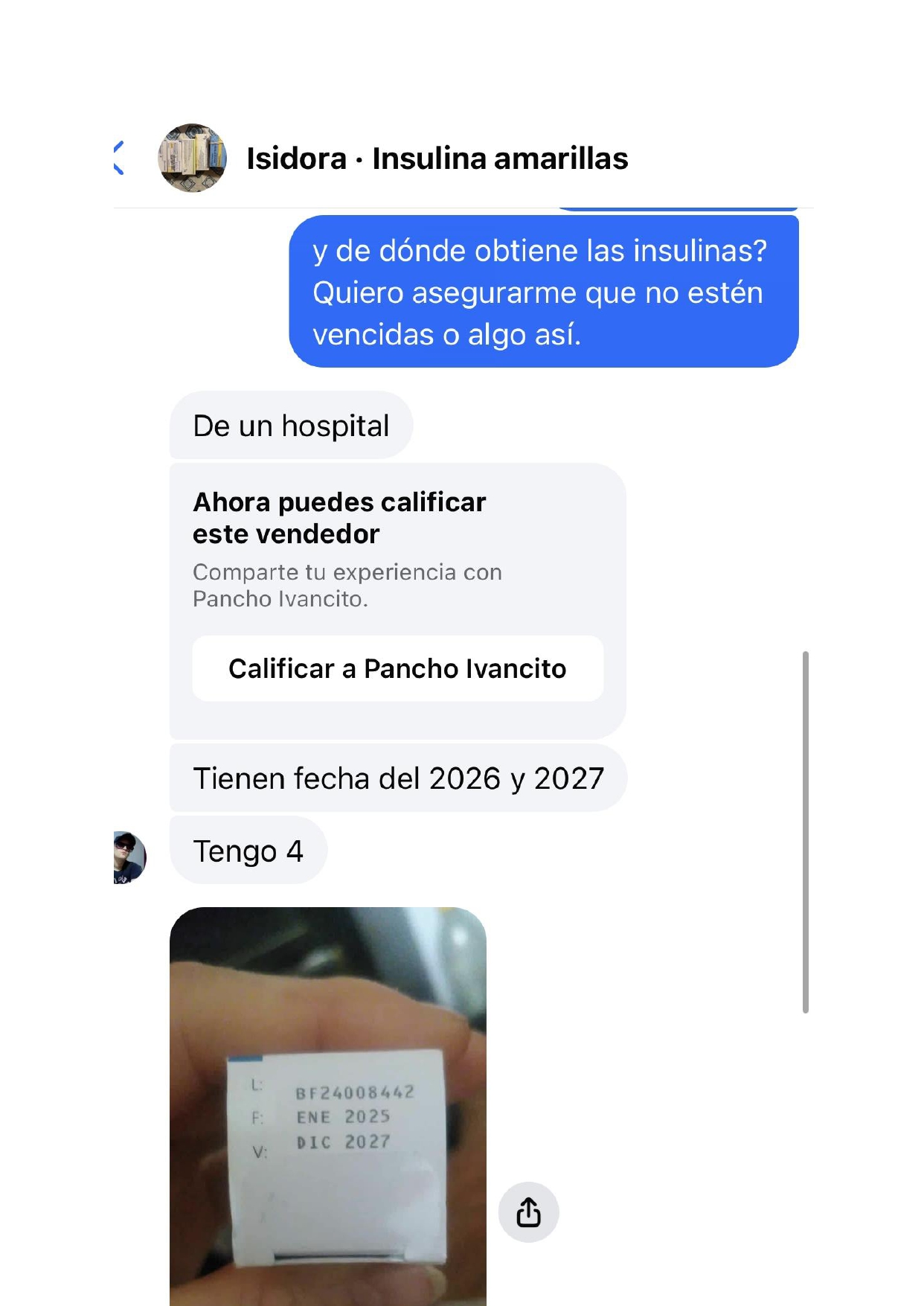 —Le escribí a una señora que vendía insulina por el grupo “Recetas médicas, cheque y otros (CHILE)”. Le pregunté si estaban vencidas, me dijo que eran del hospital y que vencían en 2026. A las dos horas ya me estaba insistiendo con mensajes: “¿Va a querer o no?”, “¿Le guardo las cuatro?”.