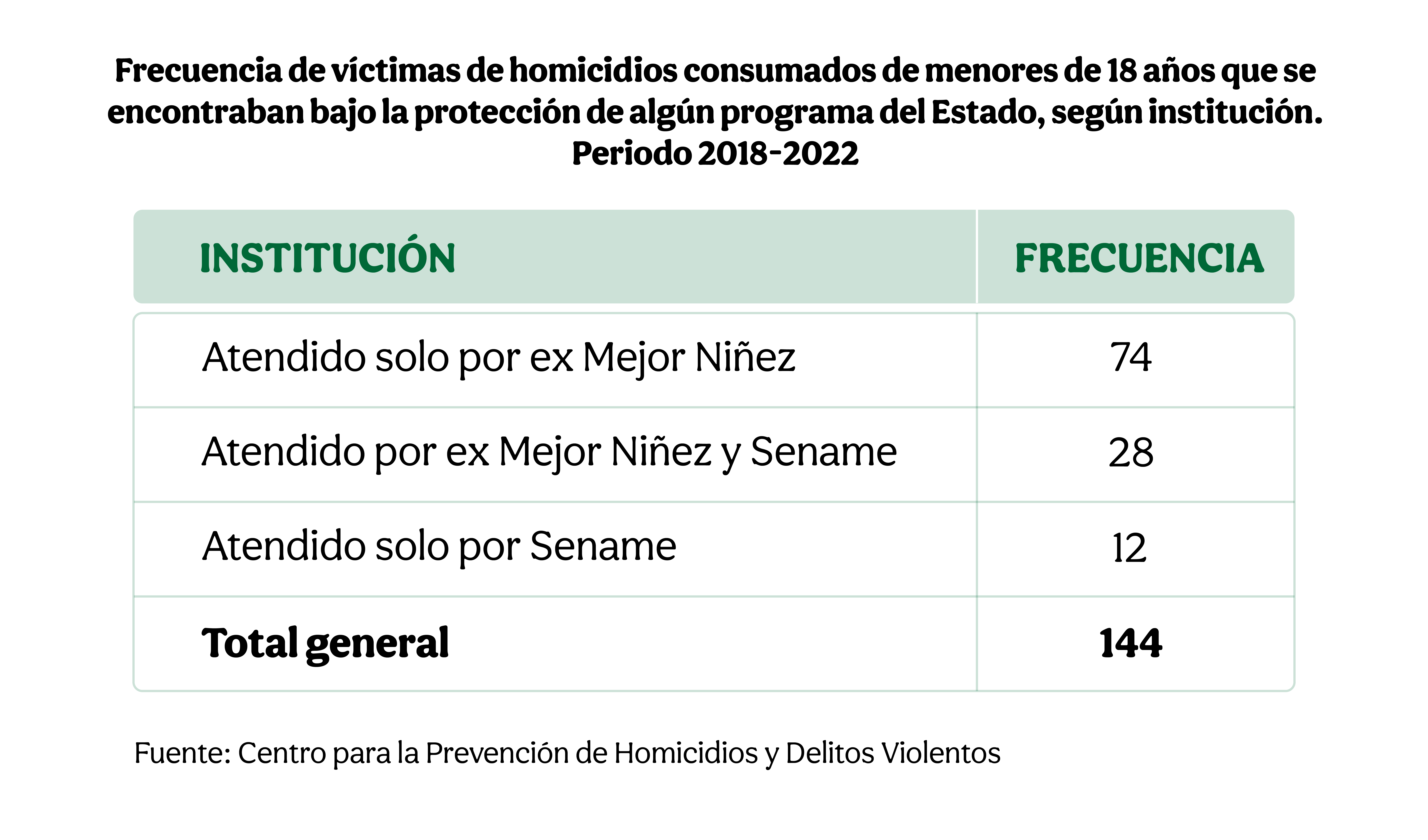 Este informe revela una alarmante estadística: 52,5% de los niños, niñas y adolescentes víctimas de homicidios, entre 2018 y 2022, estaban bajo el cuidado de algún programa estatal, como el Servicio Nacional de Menores (Sename) o el Servicio de Protección Especializada a la Niñez y Adolescencia (ex Mejor Niñez).