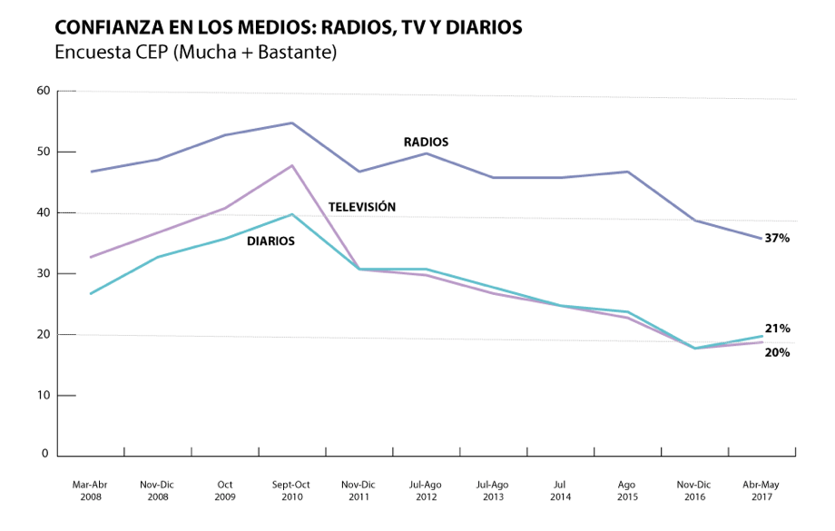 Según la encuesta CEP de mayo-julio de 2017, más del 60% de los encuestados confía poco o nada en los medios: un 61,8% confía poco o nada en las radios; un 77,2% en los diarios y un 78,9% en la TV.