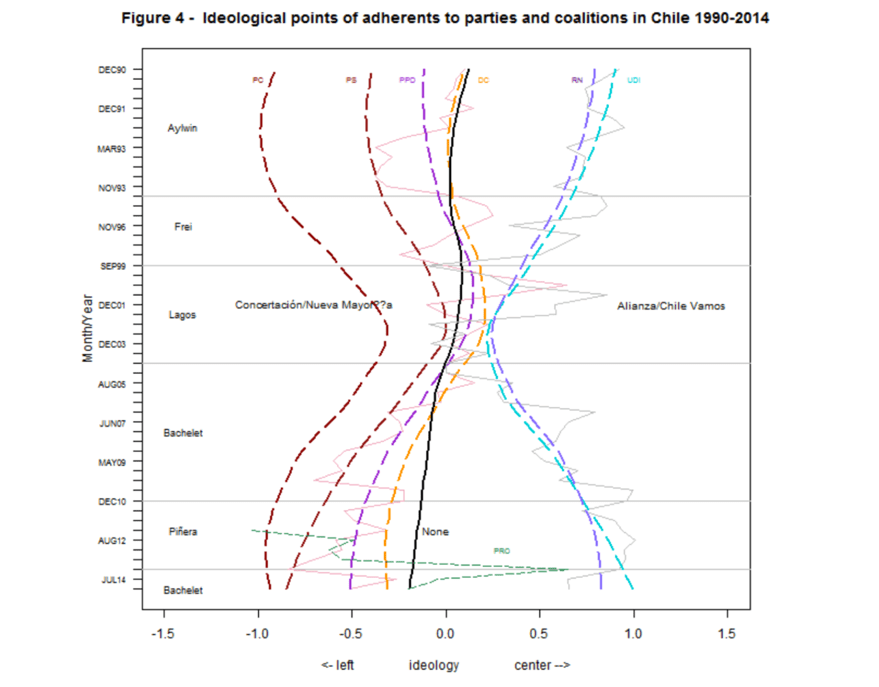 Analizando los datos de la encuesta CEP entre 1990 y 2014, los autores ubican a los adherentes de los principales partidos políticos en un eje izquierda­–derecha. Se observa que desde el 90 hasta mediados de 2000 se produjo una convergencia, mientras en la última década la polarización ha aumentado.