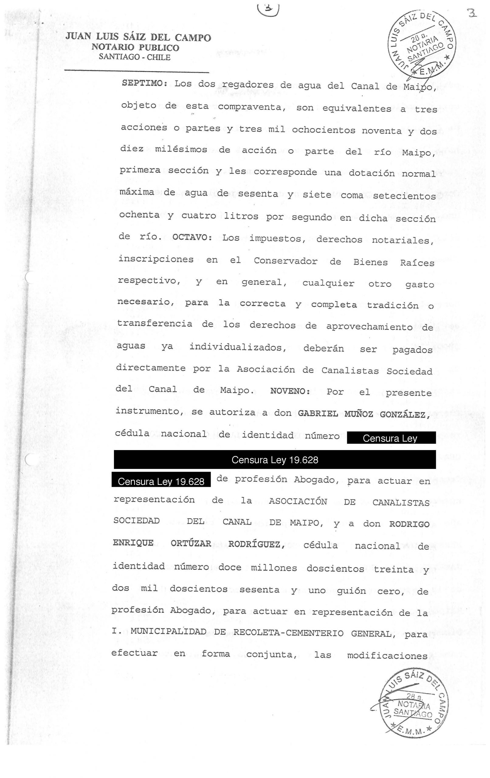 Tras una licitación pública, el 23 de junio de 2003 se pactó el negocio con la Sociedad del Canal de Maipo. Los dos regadores provenían del canal La Pólvora y, según la información presente en el contrato de la compraventa, eran equivalentes a tres acciones de agua, es decir, 67,784 l/s. El precio estipulado fue de $61.260.000 y fue pagado al contado para luego ser destinado a los fondos municipales. El valor de la transacción depende directamente de las variaciones del mercado que abastece la Ley de oferta y demanda.