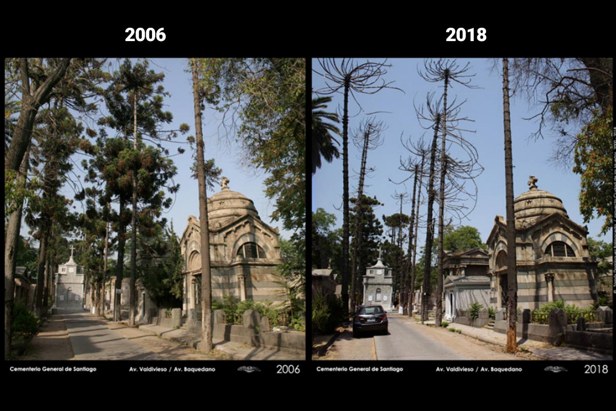 El arquitecto Tomás Domínguez demuestra a través de dos fotografías, una sacada en 2006 y la otra el 2018, cómo ha afectado la falta de agua en el cementerio. Ambas enfocan el paisaje de la Avenida Valdivieso. La primera muestra imponentes araucarias con sus copas verdes y la segunda los troncos secos de los mismos árboles. El paisaje frondoso se transformó en uno árido.